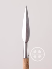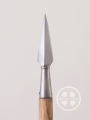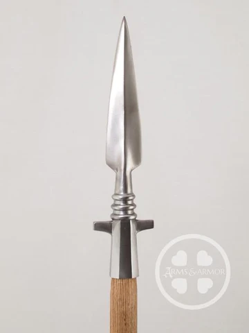 A spear is a polearm consisting of a shaft, usually of wood, with a pointed head. The head may be simply the sharpened end of the shaft itself, as is the case with fire hardened spears, or it may be made of a more durable material fastened to the shaft, such as bone, flint, obsidian, copper, bronze, iron, or steel. The most common design for hunting and/or warfare, since modern times has incorporated a metal spearhead shaped like a triangle, diamond, or leaf. The heads of fishing spears usually feature multiple sharp points, with or without barbs.